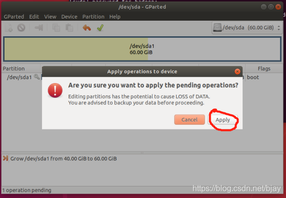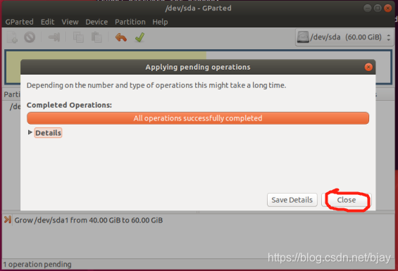 4、图中是启动了gparted后的界面。从界面中看到原来的空间是40G,新分配了20G,但这20G空间是未分配的。