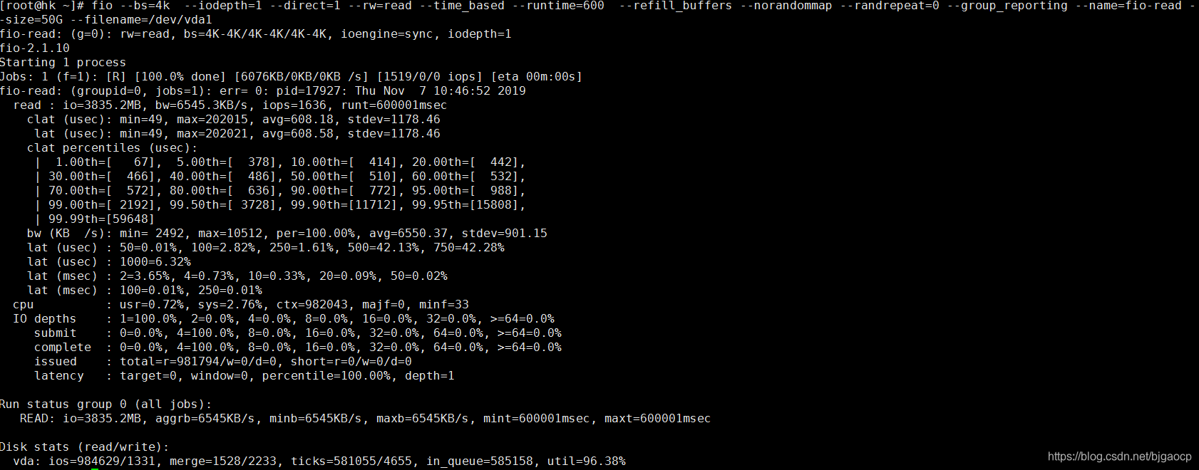 fio --bs=4k --iodepth=1 --direct=1 --rw=read --time_based --runtime=600 --refill_buffers --norandommap --randrepeat=0 --group_reporting --name=fio-read --size=50G --filename=/dev/vda1