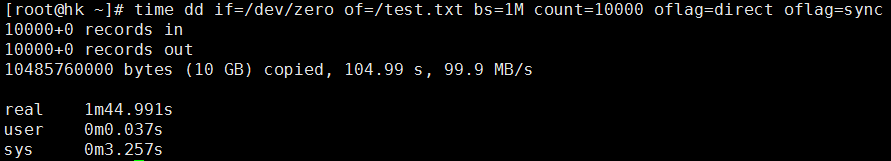 time dd if=/dev/zero of=/test.txt bs=1M count=10000 oflag=direct oflag=sync