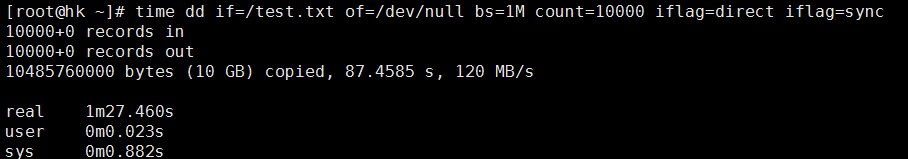 time dd if=/test.txt of=/dev/null bs=1M count=10000 iflag=direct iflag=sync