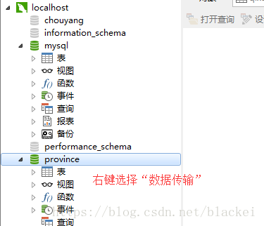回到mysql中,找到需要的数据库文件,右键点击,选择“数据传输”: