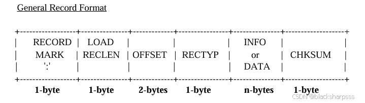 xx:类型 00-代表本行是数据记录、01-代表HEX文件结束、02-标识扩展段地址记录,表明后面所有数据地址需要加上段地址左移4位、03-开始段地址记录:开始段地址记录 04-标识扩展线性地址记录,后续数据地址+线性地址左移16位作为基地址,在下一个04类型前有效。05-开始线性地址记录:程序入口地址