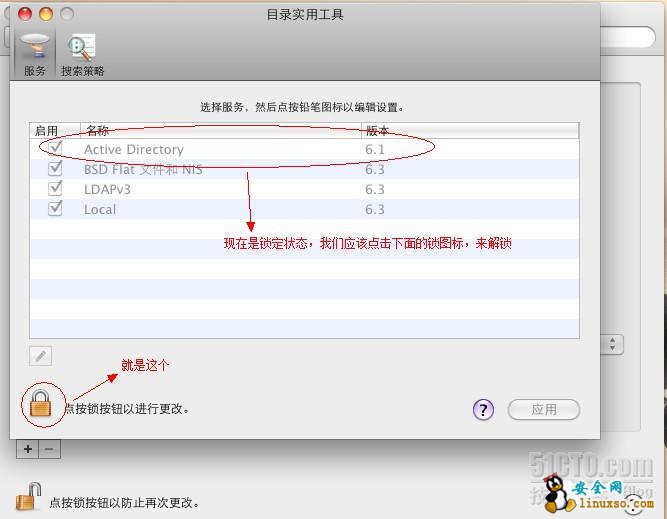 三:目录访问左下角的黄色锁标为上锁状态,双击该锁标,输入Mac OS X管理员用户的用户名和密码解锁
