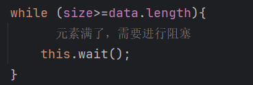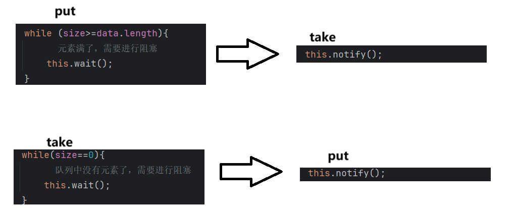 当数组满了,直接wait,有到take的中取出元素,执行到notify,解除wait