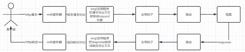 客户端--->wsgi应用程序->全局钩子--> 路由 --> 视图 --> 路由---> 全局钩子 ---> wsgi应用程序---> 客户端