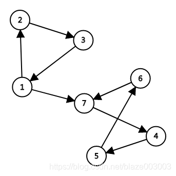 这个有向图中有两个强连通分量(2,3,1)和(7,6,4,5)。
