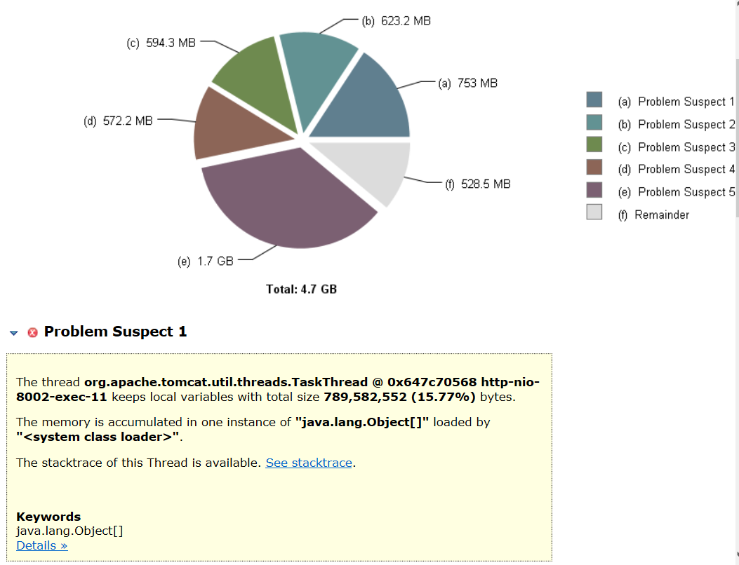 我们可以看到MAT工具自动分析后会给你列出问题嫌疑的内容:局部变量保有量达到753M,好大一对象,JVM消化不动撂挑子了。