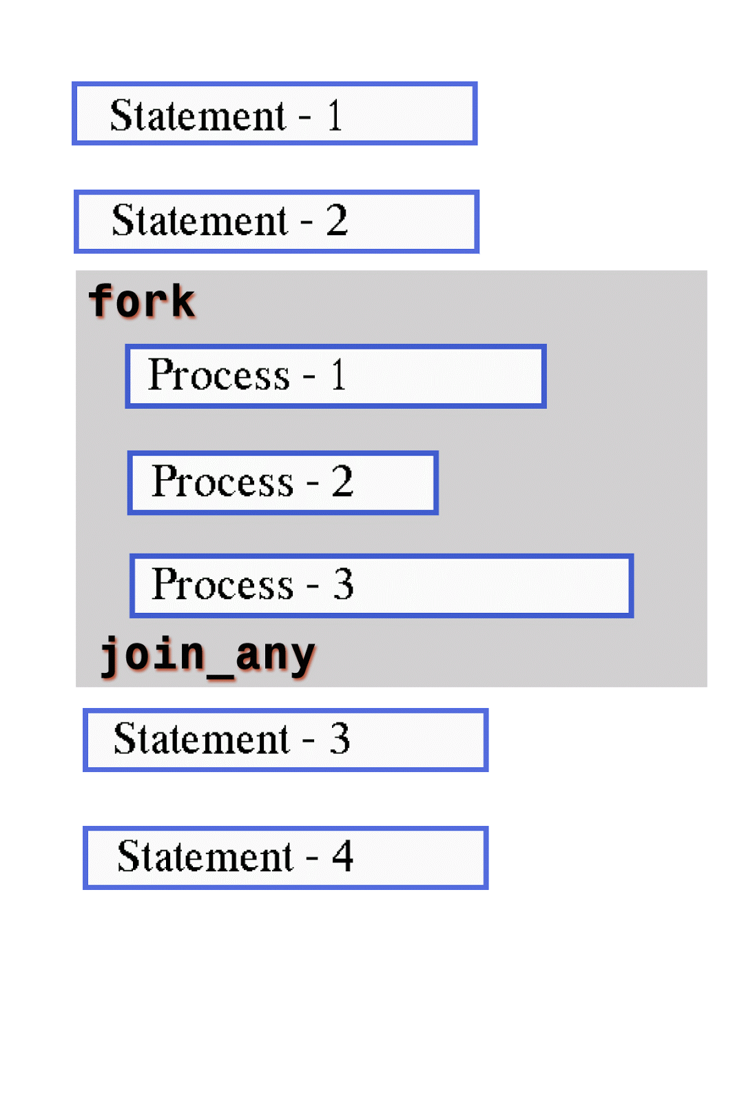 fork...join_any语句块会阻塞statement-3的执行,直至fork..join_any语句块中的任意一个线程执行完(如上图中的proceess-2)后才能开始执行statement-3。