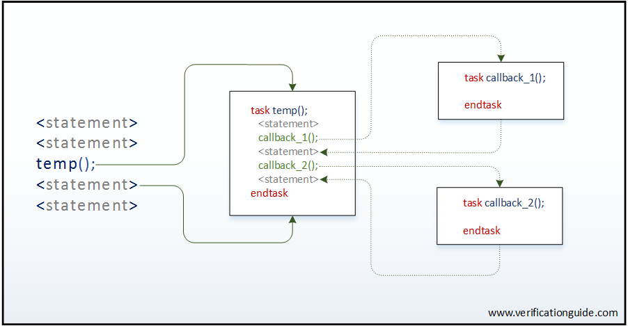 SV中的回调(callback)明确了定义方法的规则,并且指定了一个方法用来回调已经定义的该方法;简而言之就是,被调用的方法就是回调方法(callback method),调用回调方法的方法称为回调勾(callback hook),回调方法一般是虚方法(dummy method),一般通过继承来进行覆盖重写.