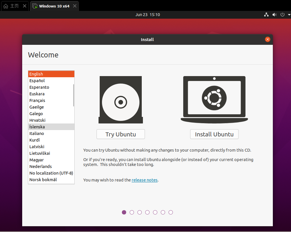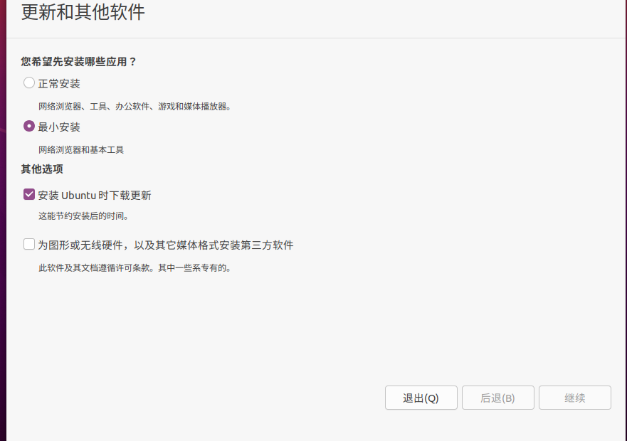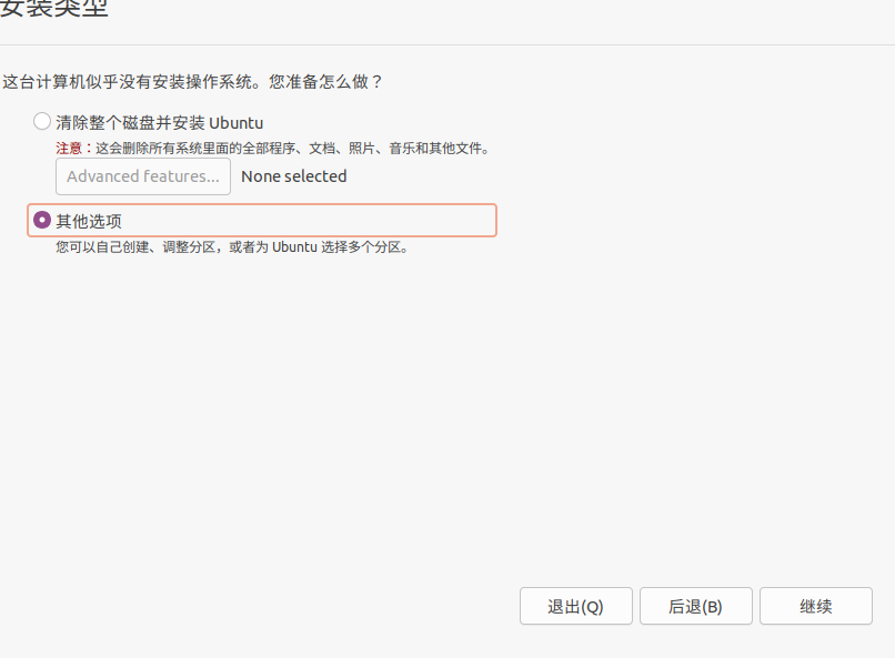 开启虚拟机,左边选择对应语言,选择install Ubuntu ,其他选项选择如下: