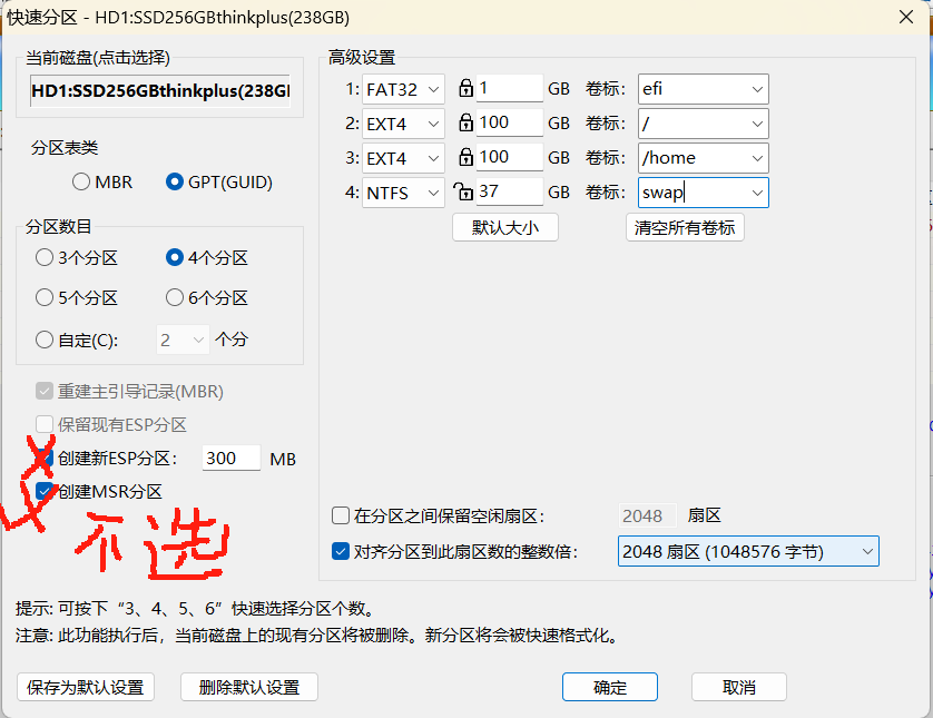 注:四个分区不建议打乱顺序,新建esp分区不选是因为efi分区已发挥 相同作用,四个分区的解释如下: