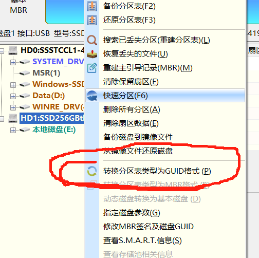 - 硬盘位置右键,查看分区表类型,确保分区表类型为GUID格式,即点击如下