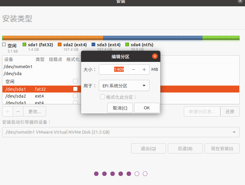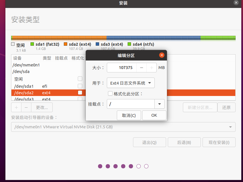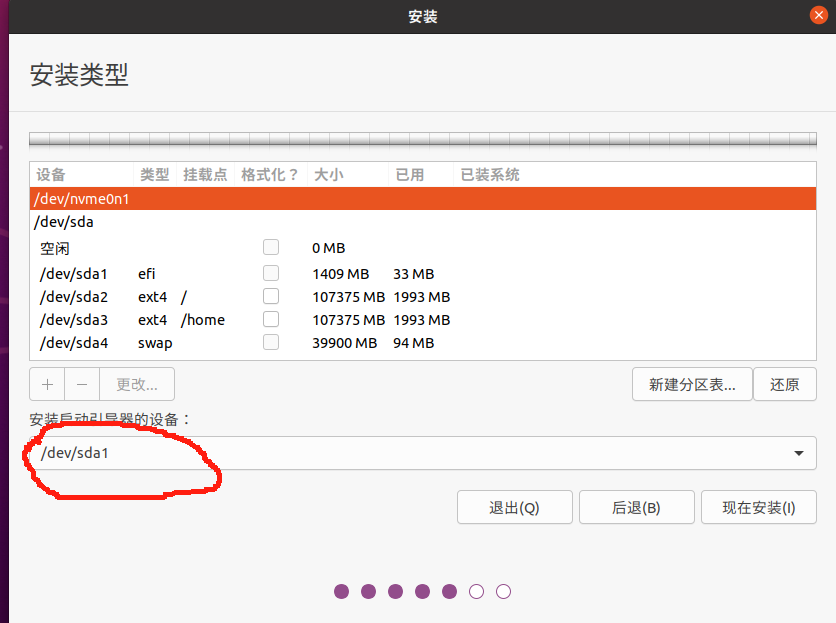 即下面的/dev/sda1、/dev/sda2、/dev/sda3、/dev/sda4(记得把[安装启动引导的设备]设置为/dev/sda1)