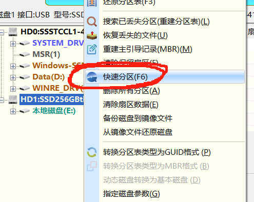 - 快速分区也在硬盘右键,分区参数如下,确认保存即可