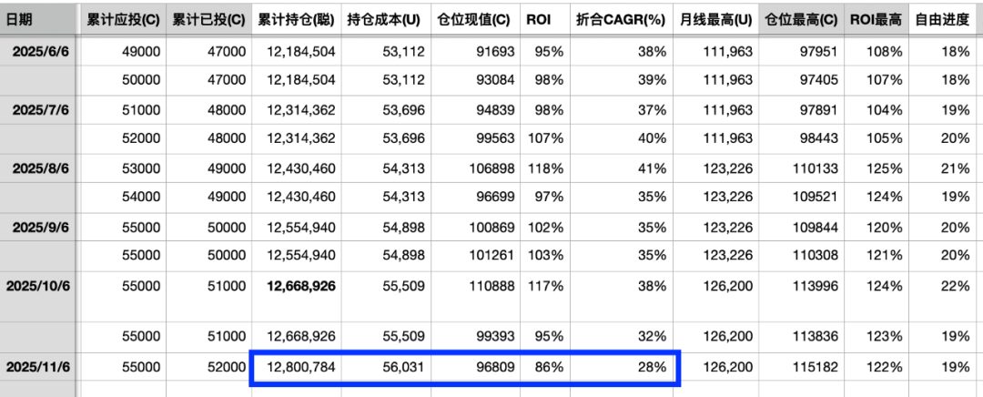 本次11月A份加仓又因为忘记而迟了几天,错过了6号102k左右的低价。今天10号以现价106k追加。加仓后持仓量升至1280万聪。但由于BTC价格回撤,仓位价值跌回A5水平。折算CAGR也跌破30%。