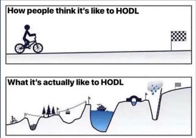 长期持有(HODL)听起来很容易,但就像那张经典的梗图所画的,人们以为的长期持有之路和真实的长期持有之路,实在是天壤之别。