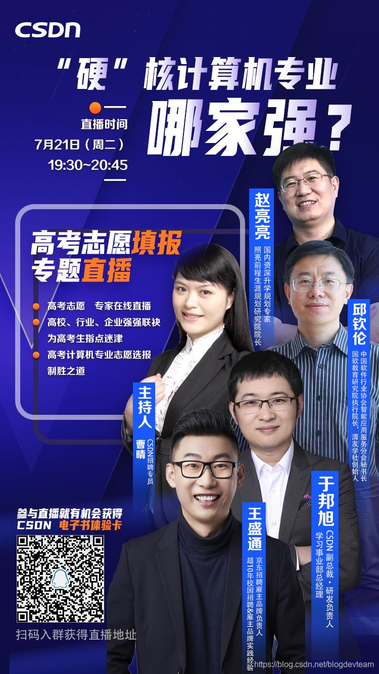 高考计算机相关志愿到底如何填报?如何避免雷区?请锁定7月21日19:30,优快云为您带来的【“硬”核计算机专业哪家强——高考志愿填报专题直播】活动,扫码入群即可获得直播地址,更有机会获得优快云电子书体验卡,在此预祝各位学子金榜题名,实现自己的梦想。
