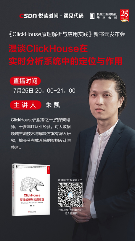 他将带着他的ClickHouse实战经验和浓缩在《ClickHouse原理解析与应用实践》这本书中的精华,在7月25日 20点整,在【悦读时间 遇见代码】直播栏目中带领所有萌新们了解为何”实效性”在分析监控系统领域如此重要,以及ClickHouse 能够为这一领域带来哪些改观。