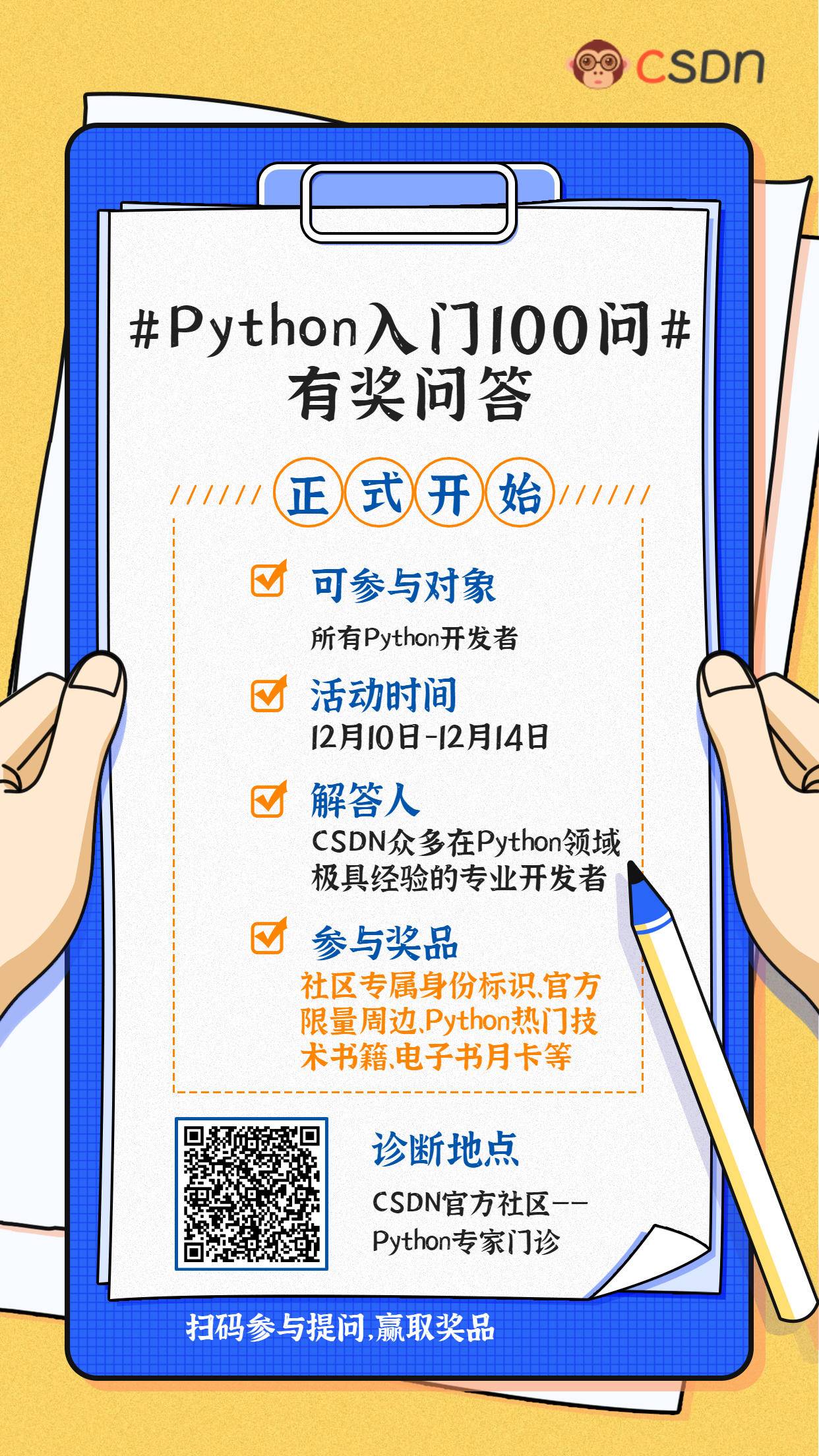 为了帮助刚入门Python的开发者,【Python专家门诊】将召集优快云上所有Python领域极具经验的专业开发者前来“坐诊”,为大家集中解答入门Python相关的问题!文章指路→Python专家门诊,有奖问答倒计时!
