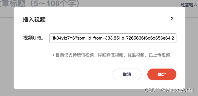 | Step1 在创作中心/内容管理/视频中上传视频; Step2 在本地选择想要上传的视频; Step3 为视频添加基本信息,如标题、标签、封面等; Step4 待视频审核通过后,复制视频地址; Step5 在编辑器中选择插入视频,粘贴上述视频地址; | Step1 在编辑器中选择插入视频,点击去上传(或在创作中心/内容管理/视频中上传视频) Step2 为视频添加基本信息,如标题、标签、封面等后待审核通过 Step3 在已有视频列表,选择要插入的视频 |