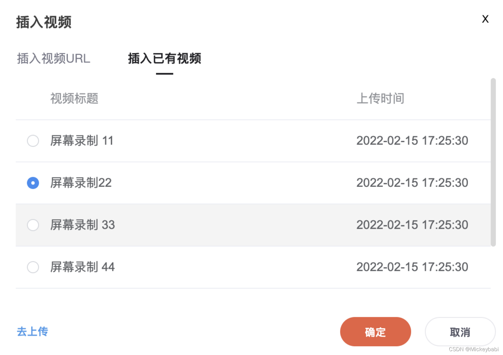 - 去上传,支持点击跳转至视频业务模块上传视频
