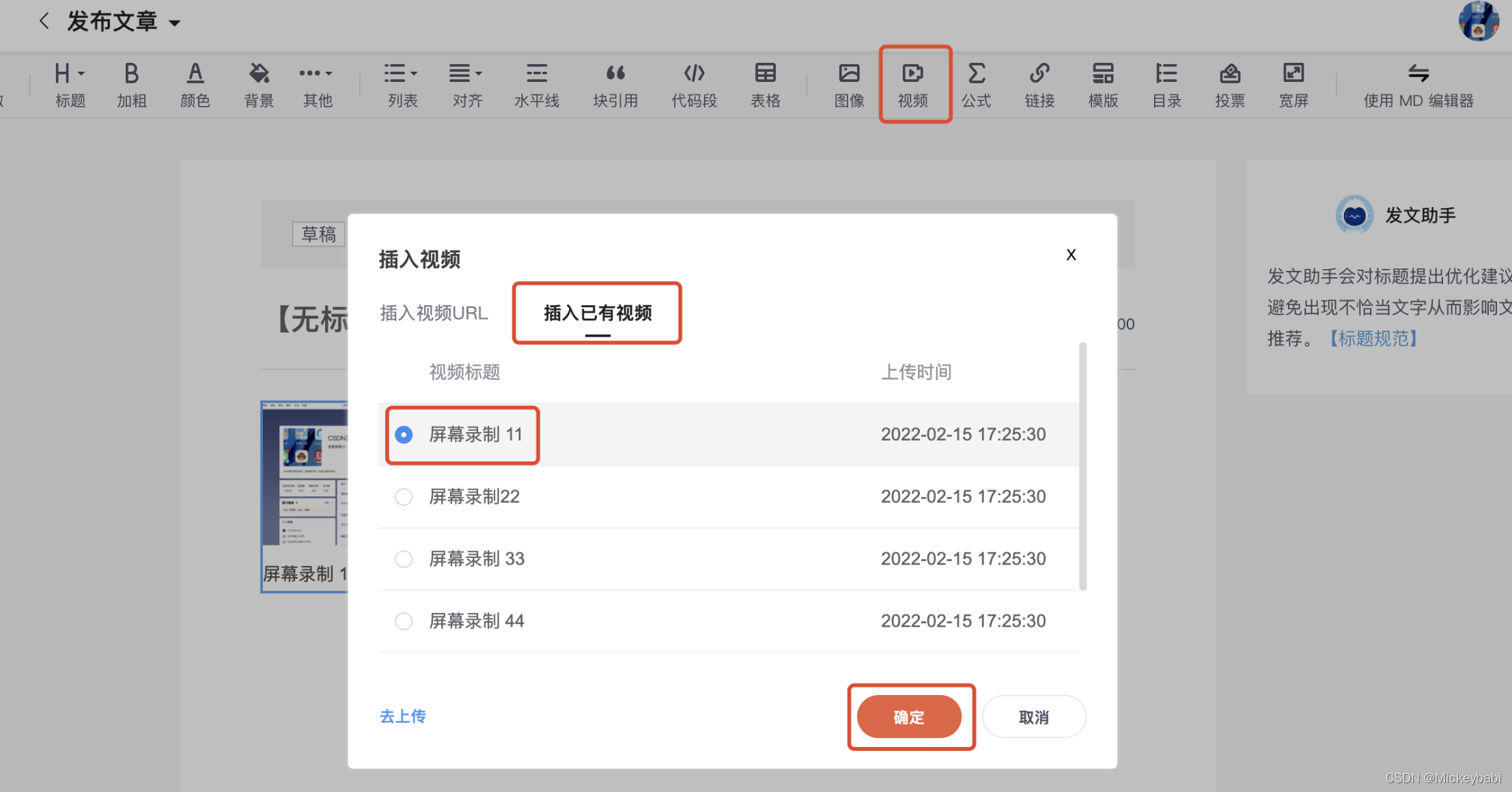 插入视频:点击「视频-插入已有视频」,列表会展示账号下所有审核已通过的视频,选择想要插入的视频后点击确定即可。