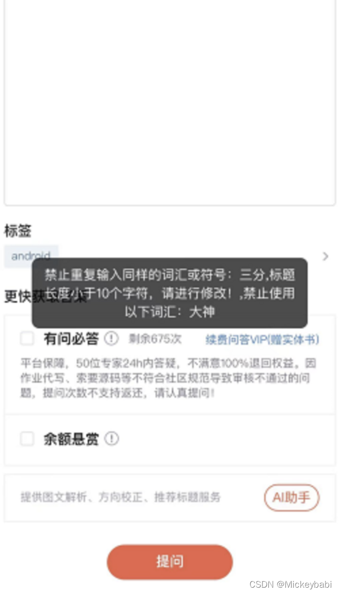 为提升提问效率、提高问题质量,APP端提问的正文部分也接入了AI助手检测。正确的提问方式和内容能够让其他用户更快地理解你的问题,在这里也建议大家发布提问前参考提问建议~