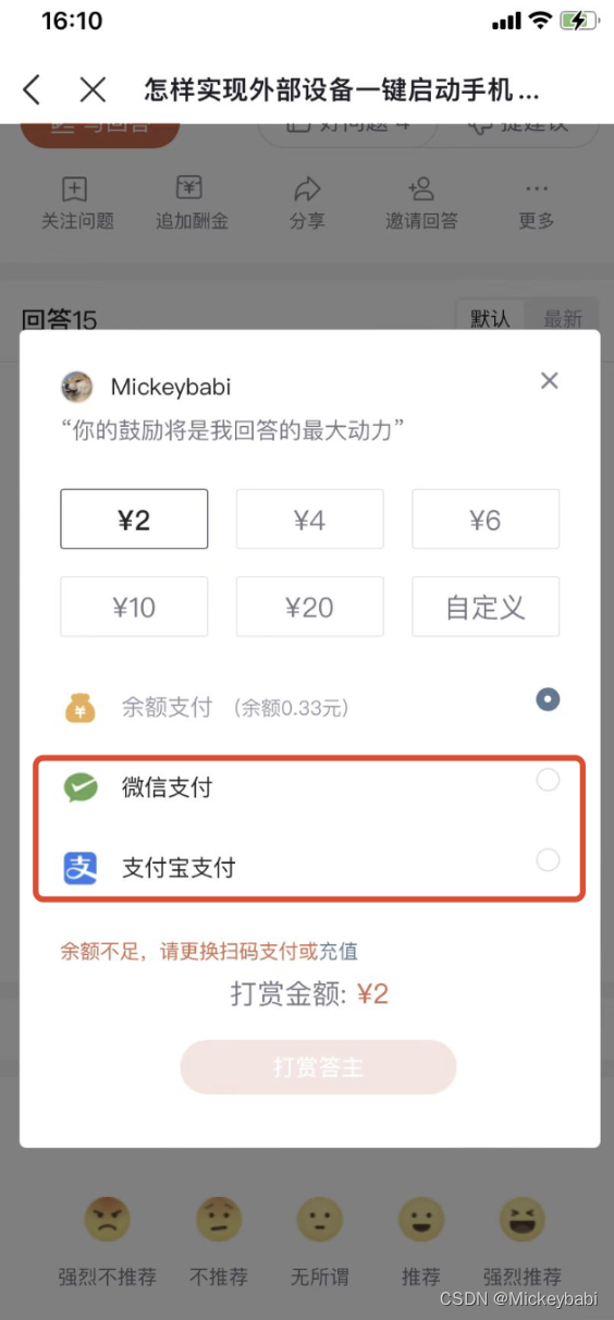 为贴合大家的支付习惯,APP端回答打赏支持支付宝和微信啦,遇到对你有帮助的回答,希望大家可以不吝点赞、评价和打赏~