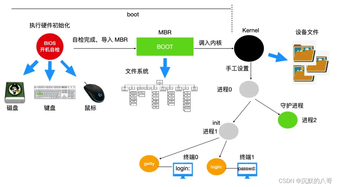 - 内核创建第一个用户空间进程(init或systemd,取决于发行版)。