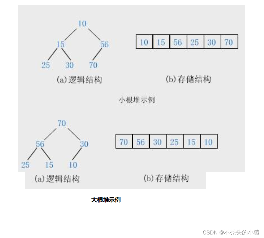 如果将一些元素集合按照完全二叉树的顺序存储方式存储在一个一维数组中,并且满足任意一个节点的值总是不大于或不小于其父节点的值,则将根节点最大的堆叫做最大堆或大根堆,根节点最小的堆叫做最小堆或小根堆。