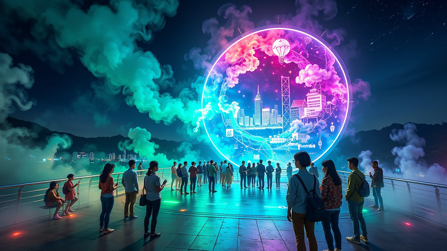 在南山观景台上,环形全息火锅中,市民们投入创意,蒸汽凝结成光芒闪烁的项目书,夜空中的灯光秀令人惊叹。蒸汽凝结成发光项目书,展示灯光秀。观景台设计独特,开阔的视野让人领略到城市的璀璨与生命力,夜空中的灯光秀与平台的照明相辅相成,充满创意的热情在空气中流动,每一个灵感都可能是未来的种子。