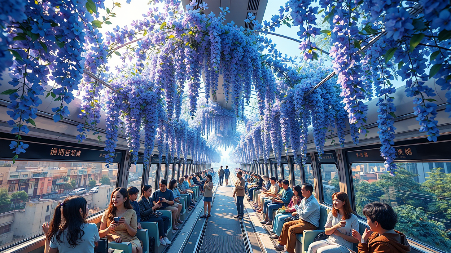 在生态廊道中,轻轨车厢顶部盛开的蓝花楹,乘客用手机认养,让自然与人文巧妙融合。乘客手机认养廊道植物,车窗显示植物的二氧化碳转化量。轻轨车厢设计现代而通透,顶部种植的蓝花楹与车窗外的城市景观交相辉映,柔和的灯光与自然光交织,整个空间洋溢着活力与生机,每一朵花都在为这座城市的呼吸添彩。