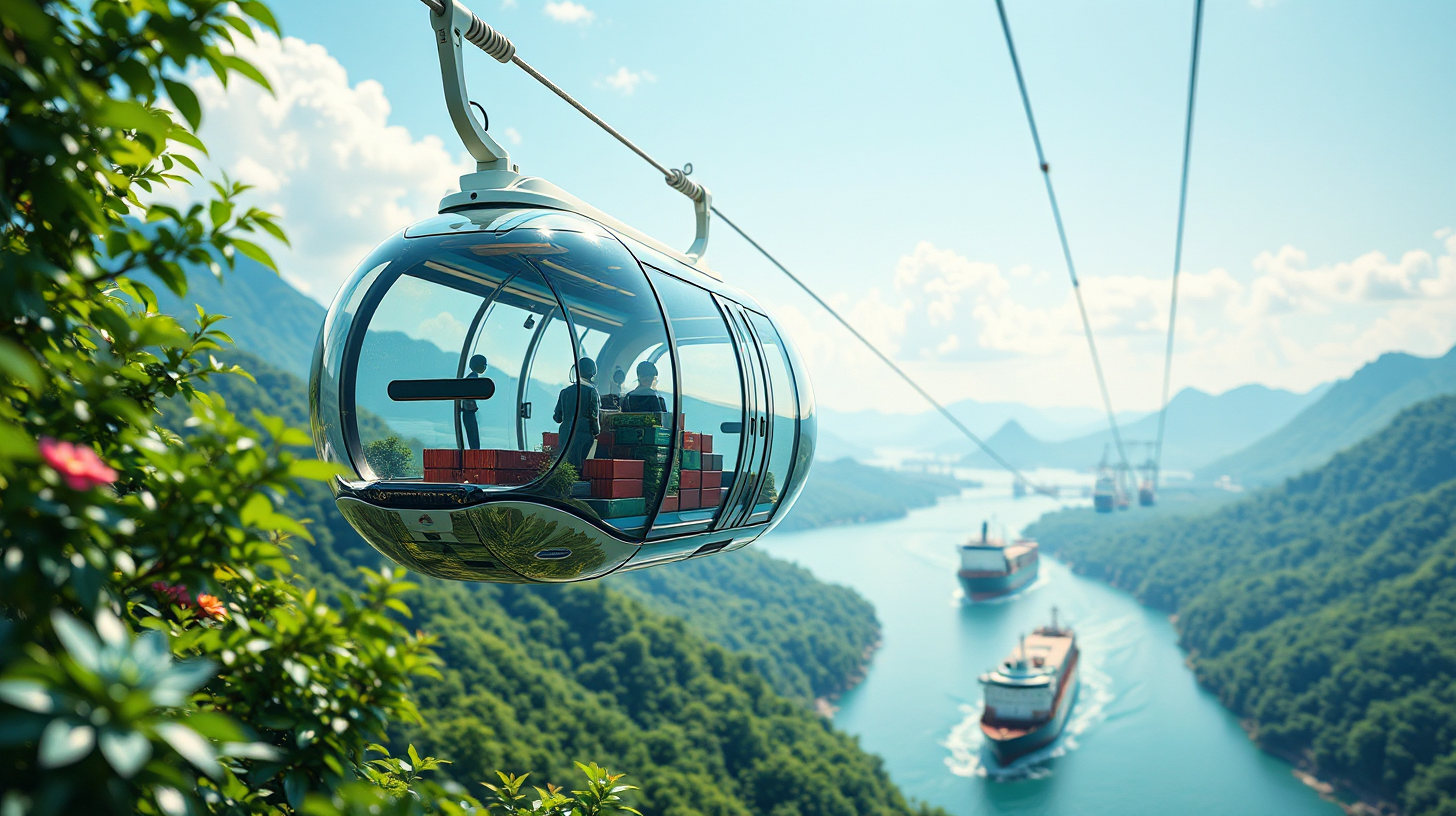 在改造后的长江索道上,透明胶囊舱内的现代设计与下方流动的货轮拼图完美结合,展现了科技的协同。下方货轮自动排列,构成待运输的物资拼图,科技与自然的结合展现出未来的希望。镜头逐渐拉近,展现透明胶囊舱内的现代科技与外部景观的对比,未来的运输网络在河面上编织出紧密的联系。