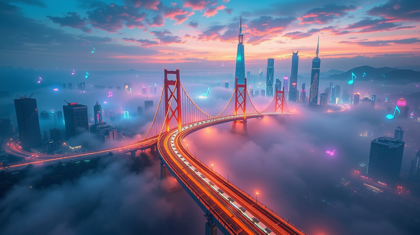 晨雾中,千厮门大桥宛如琴弦般闪烁,一条轻轨穿梭在楼宇之间,桥面上的霓虹光轨随着车辆的行驶,如音符般跃动。轻轨缓缓驶过,车身在雾中若隐若现,洒下璀璨的光芒。晨雾中舞动的光影给场景增添了灵动与神秘感,展现出城市的动感与生机,这座城市如同一首交响乐,在晨光与雾气中缓缓奏响。