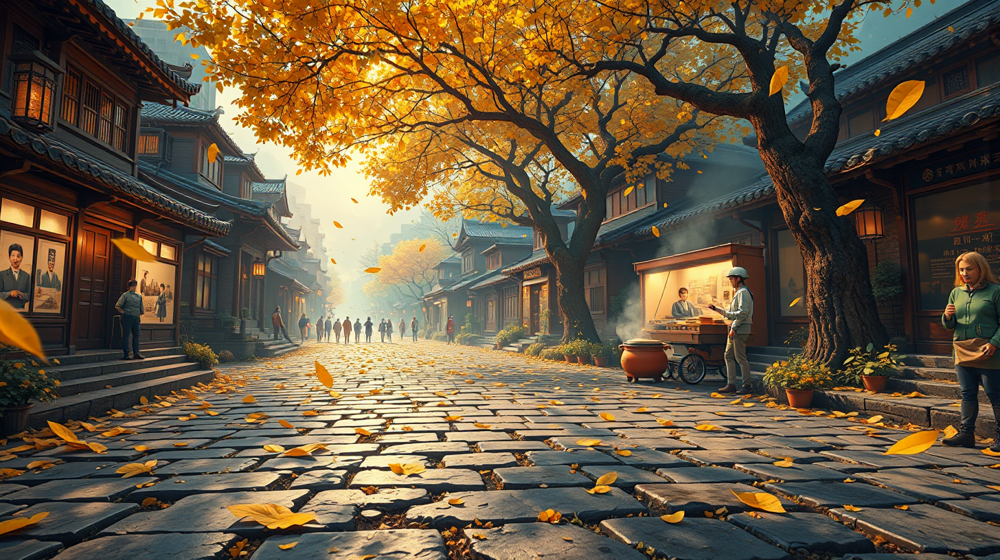 在山城步道上,石板上浮现的老重庆历史影像与现代物流机器人并肩作业,AR投影则把黄葛树上的落叶转化为虚拟火锅食材。游客兴奋地用手机扫描黄葛树,落叶化作虚拟火锅食材。历史与现代的交汇让人感受到城市的灵魂,温暖的光线增强了过去与现在的互动,每一片落叶都在诉说着这座城市的故事。