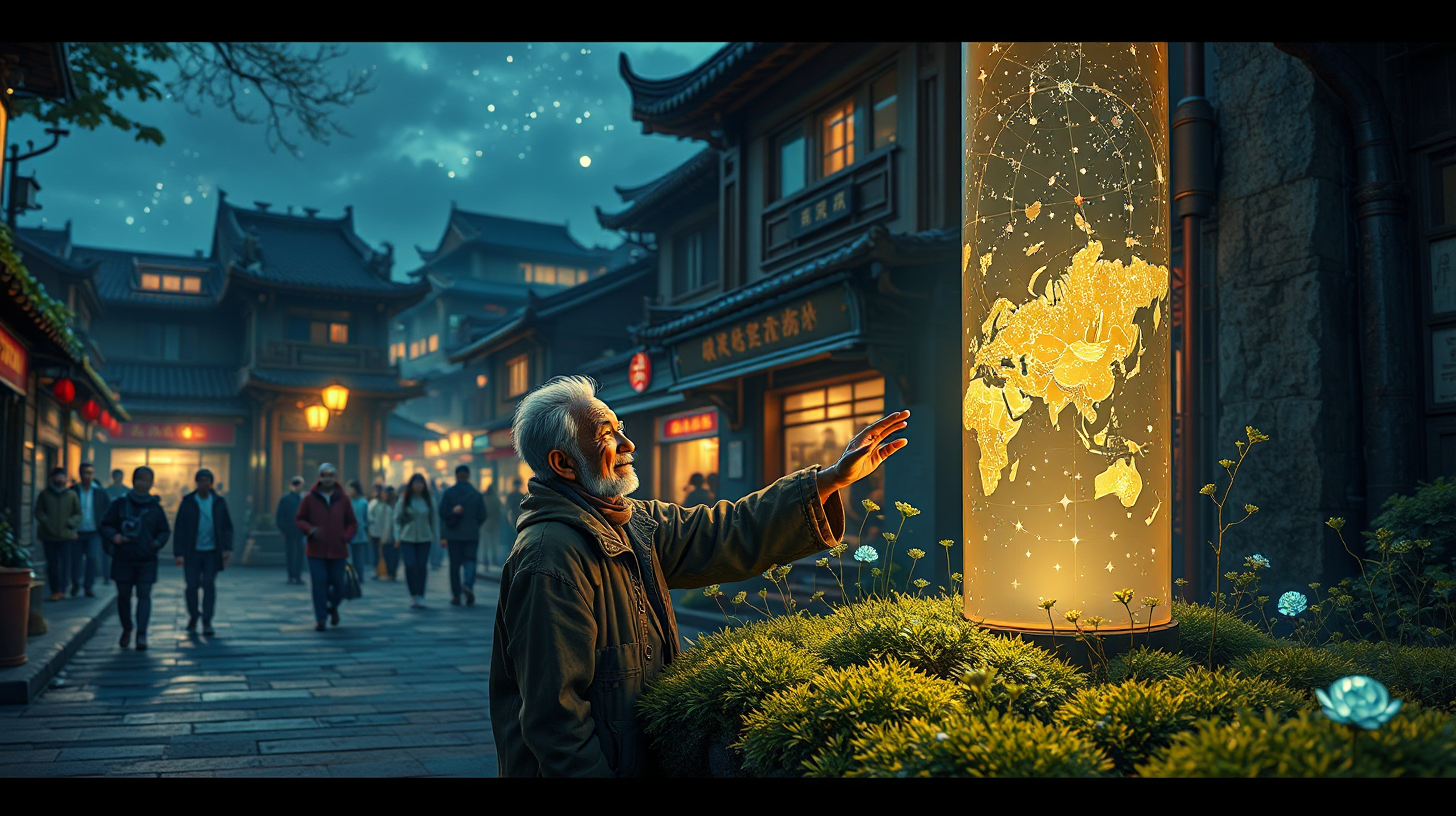 胡同口的槐树下,智能灯柱正将北斗星图投射在青石板路上。迷路的张爷爷触碰灯柱时,发光苔藓立即在路面标记出回家路径,灯芯旋转投射出他年轻时在此踢毽子的全息影像——虚拟的28岁张师傅正把毽子踢过垂花门,惊起一群像素喜鹊。当导航机器人滑到跟前时,灯柱突然播放起京剧《定军山》,这是老伴生前最爱的唱段。近景特写老人颤抖的手抚过灯柱表面的智能苔藓,那些发光孢子随着《夜深沉》的鼓点明暗起伏,将斑驳的砖墙染成了回忆的琥珀色。