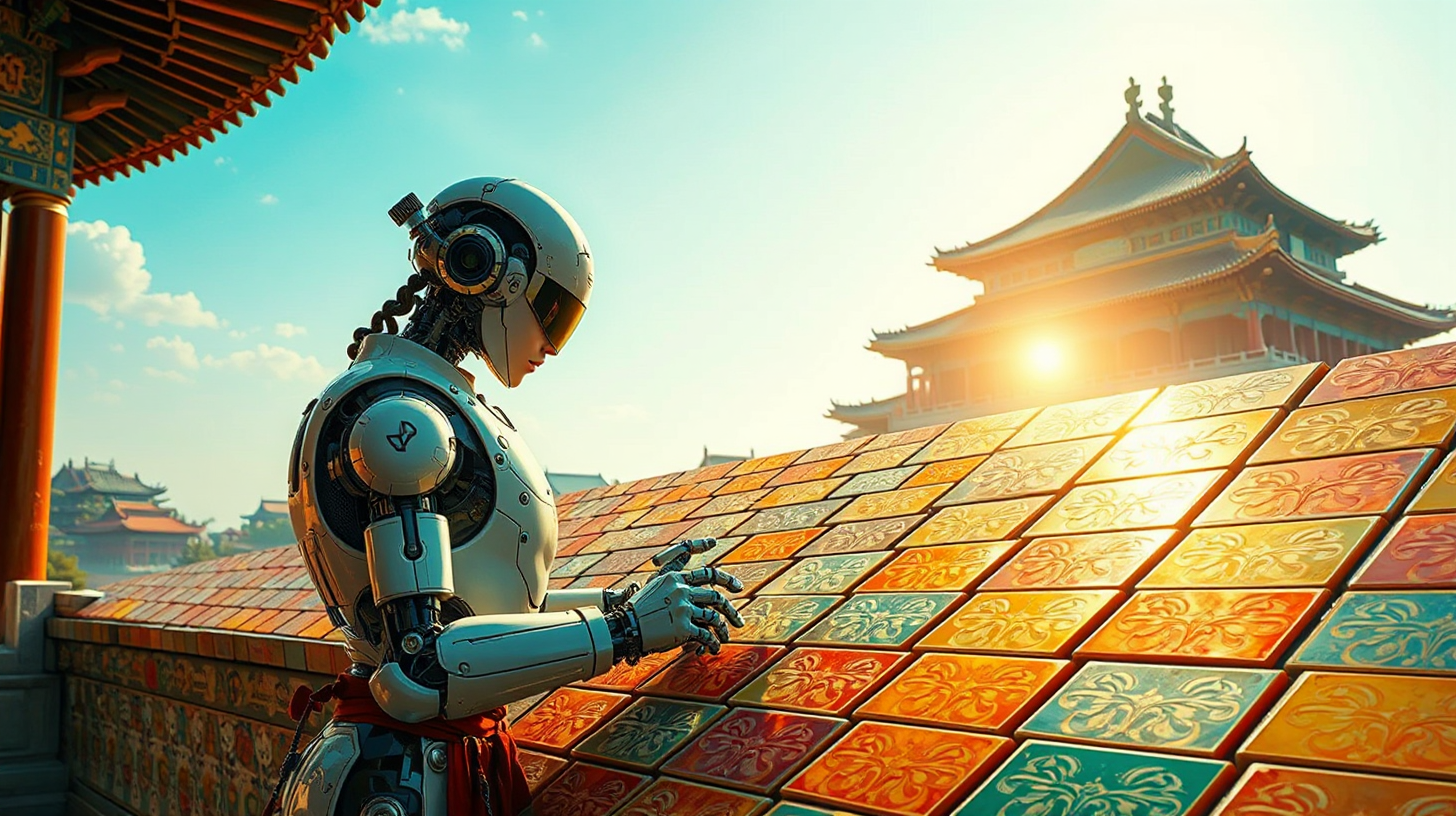 故宫的琉璃瓦屋顶在晨光中流转着金红色光晕,老匠人布满皱纹的双手正用錾子调整瓦片角度,身旁的六轴机械臂以毫米级精度递送着新烧制的琉璃构件。修复现场弥漫着传统大漆的醇厚气息,智能检测仪在瓦当表面投射出全息应力图,古老滴水兽的眼瞳里隐约闪动着数据流。当游客触碰瓦片时,二十四节气AR图景便在空中展开——惊蛰时分的农耕图里,虚拟老农正将种子撒向泛起电子涟漪的虚拟水田。俯视镜头从特写的老匠人手套拉升至全景,整个太和殿屋顶宛如燃烧的凤凰,琉璃瓦缝隙间嵌着的太阳能晶片正将晨光转化为跃动的能量。