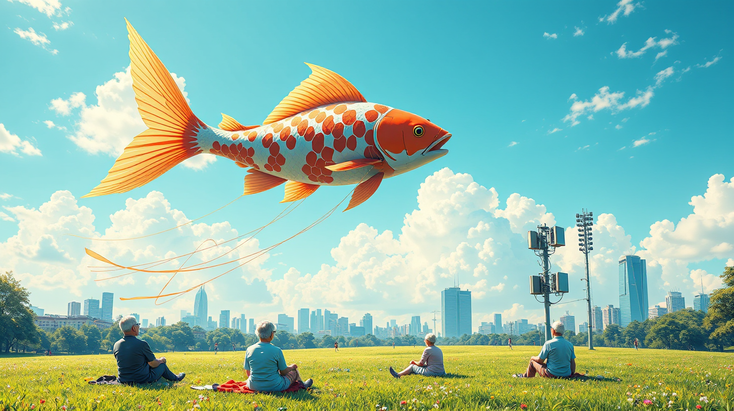 奥林匹克公园上空游弋着百米长的锦鲤风筝群,每片鳞甲都是柔性光伏膜在风中翕动。当PM2.5颗粒接触鳞片表面时,催化层立即将其分解成氮氧分子,在风筝尾迹拖出淡淡的彩虹光带。放风筝的老人们坐在智能草坪上,手中线轴连接着会唱歌的空气质量桩,当AQI优于35时,《茉莉花》的旋律便随着风筝线的震颤飘向云端。中景镜头里,穿太极服的王大爷正教孙女调整风筝角度,女孩的AR眼镜显示着实时净化数据,她手中的风筝线突然亮起蓝光——一只机械雨燕正衔着草莓快递穿过锦鲤群,在天空划出甜甜的航迹云。