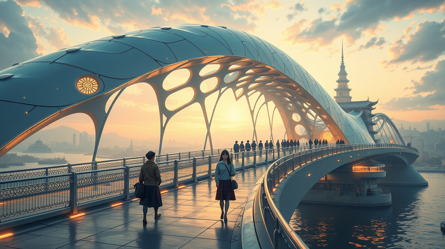 描述:晨雾中的悬浮桥正在变形,记忆合金模块如龙鳞般翻涌。赶早市的姑娘踏过桥面时,清末镖师的全息影像正押送着虚拟镖车与她并行。桥栏突然升起星空影院,放映着用两岸居民脑波合成的集体记忆影片。当京津两地的晨钟同时响起,桥体化作万千光粒消散又重组,在霞光中定格为连接古今的时空门廊。