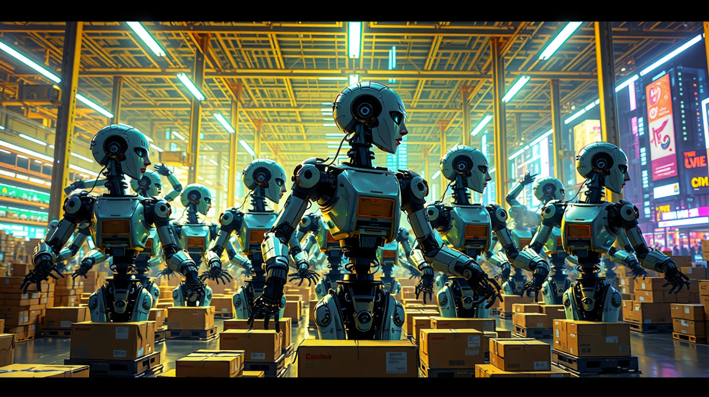 作图提示词:<In a brightly illuminated logistics warehouse, robotic arms rhythmically dance in unison, creating a visual symphony as they sort packages with utmost precision. Wide shot, highlighting the synchronization between the robotic movements and the vibrant city lights outside, infused with dynamic colors and a bustling ambiance that showcases the blend of technology and efficiency.>