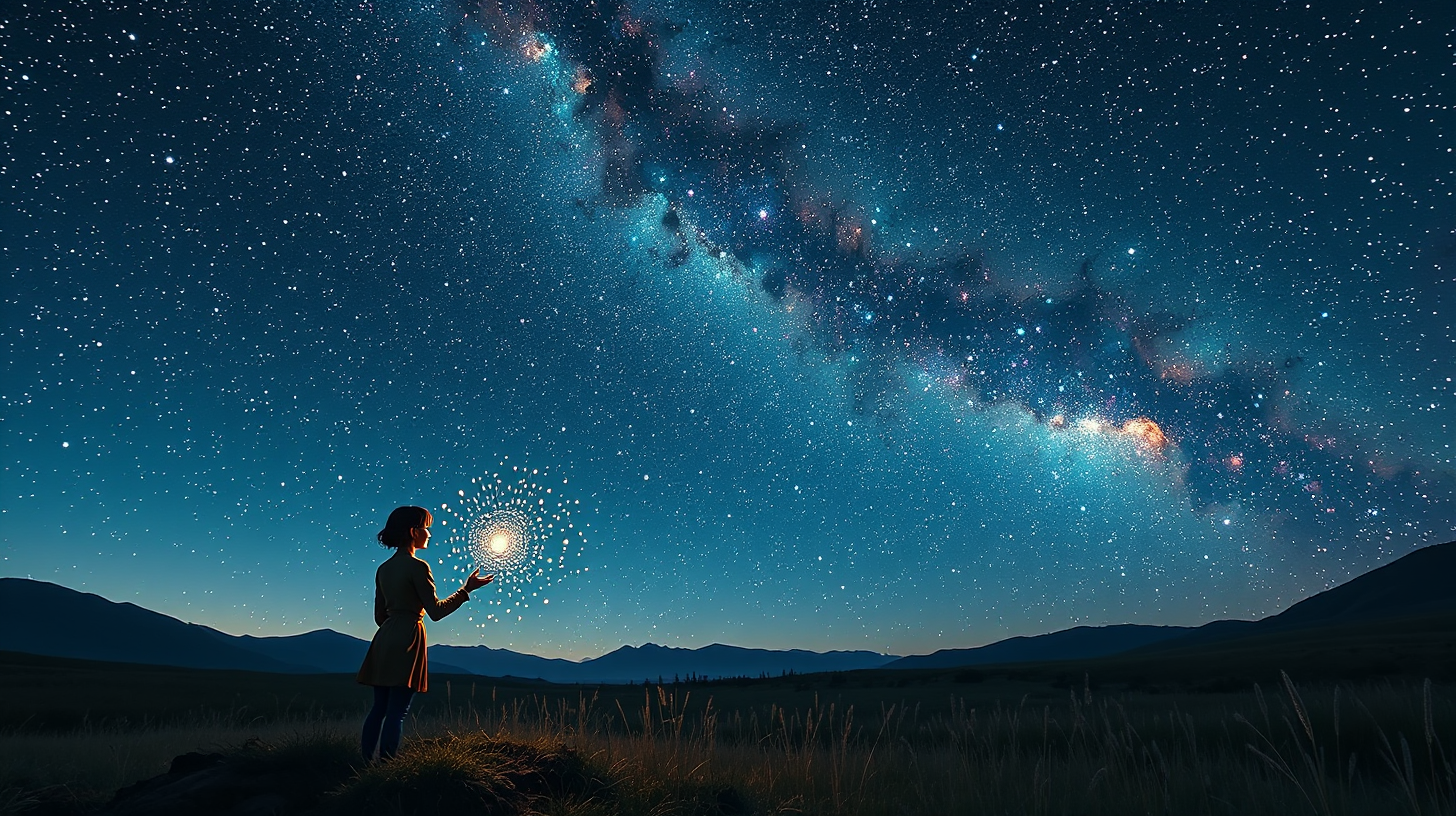 作图提示词:<Under a breathtaking starry night, an innovative artist employs augmented reality technology to draw luminous particles of light, crafting mesmerizing patterns against the canvas of a radiant celestial sky. Distant view, capturing the stunning interplay between the infinite stars and the artist’s enchanting creations, enhanced by soft, ethereal lighting that fosters a dreamlike atmosphere.>