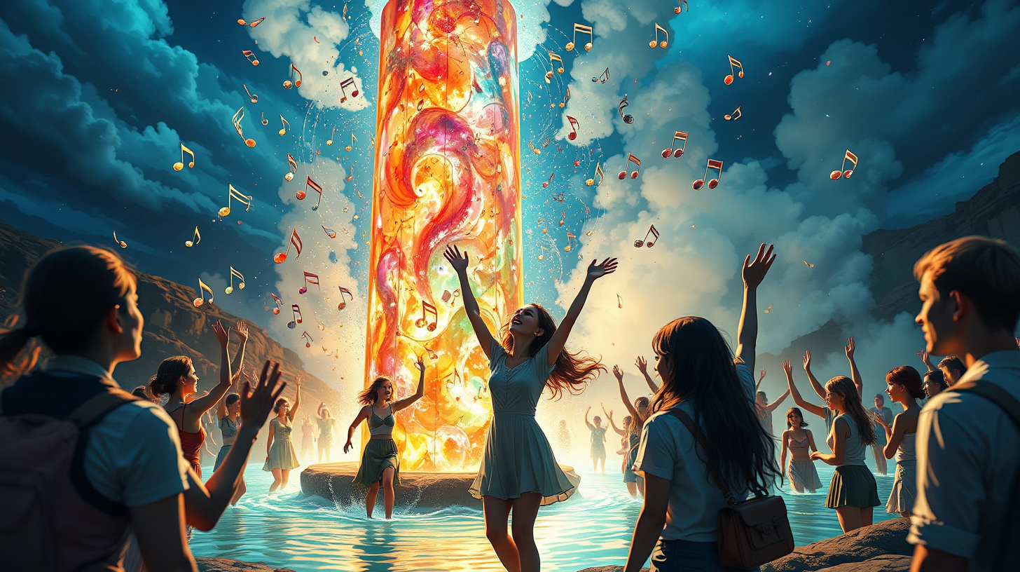 作图提示词:<Next to a geothermal spring, a vibrant symphonic pillar resonates with harmonic sounds, with floating musical notes swirling gracefully around it. People uplifted in joy engage with the environment, celebrating nature’s rhythm. Close-up shot, capturing the spirited expressions and energy around the pillar, featuring dynamic lighting and an exhilarating atmosphere that reflects cultural festivity.>