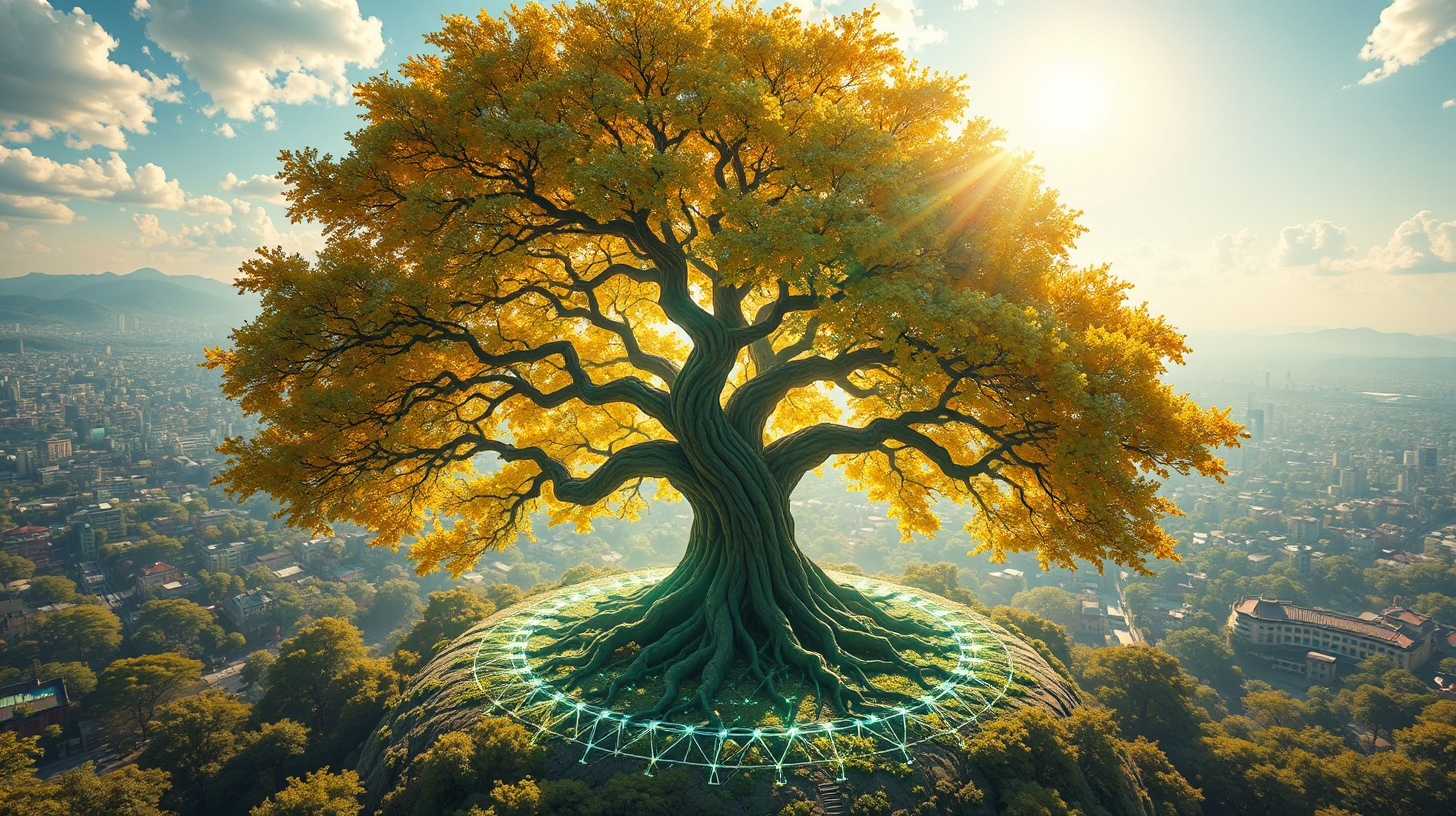 作图提示词:<In Langfang, under a bright morning sun, an ancient locust tree stands majestically, its roots elegantly interwoven with glowing quantum fiber optics at the city’s core. A holographic annular pattern illuminates the scene, telling centuries of cultural stories. Aerial view, emphasizing the intricate interaction of the tree’s roots and technology beneath its shimmering leaves, rich in vibrant hues, embodying a serene atmosphere infused with cultural depth.>