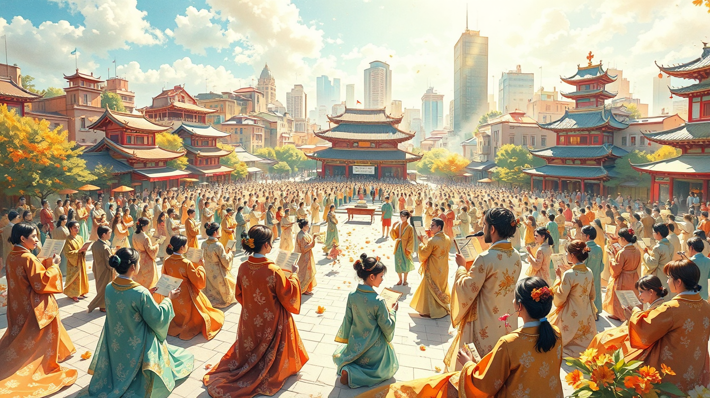 作图提示词:In a vibrant city square, traditional opera enthusiasts, dressed in flowing silk robes adorned with intricate patterns, gather, surrounded by the warmth of sunlight, as their heartfelt melodies echo through the air, symbolizing a call for ecological preservation, captured from an aerial view, with warm colors enhancing the lively energy of the scene.