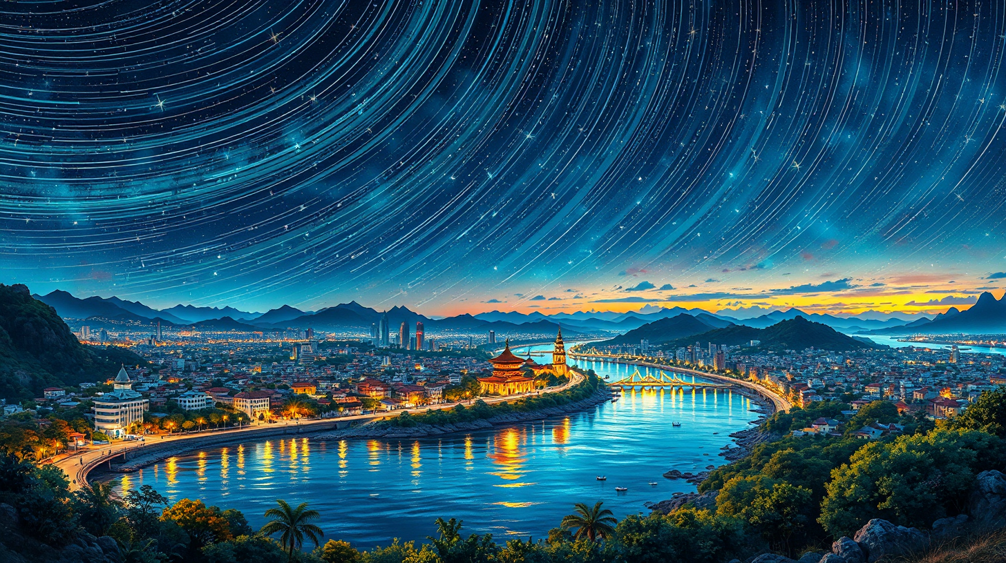 作图提示词:A breathtaking view of the Fahu River under a starry sky, with dynamic star trails and luminous points of light symbolizing cultural innovation. The scene is filled with warmth and hope, utilizing a wide-angle perspective for a panoramic effect, enhanced by vibrant colors and soft backlighting to emphasize the connection between the river, the city, and its cultural richness.