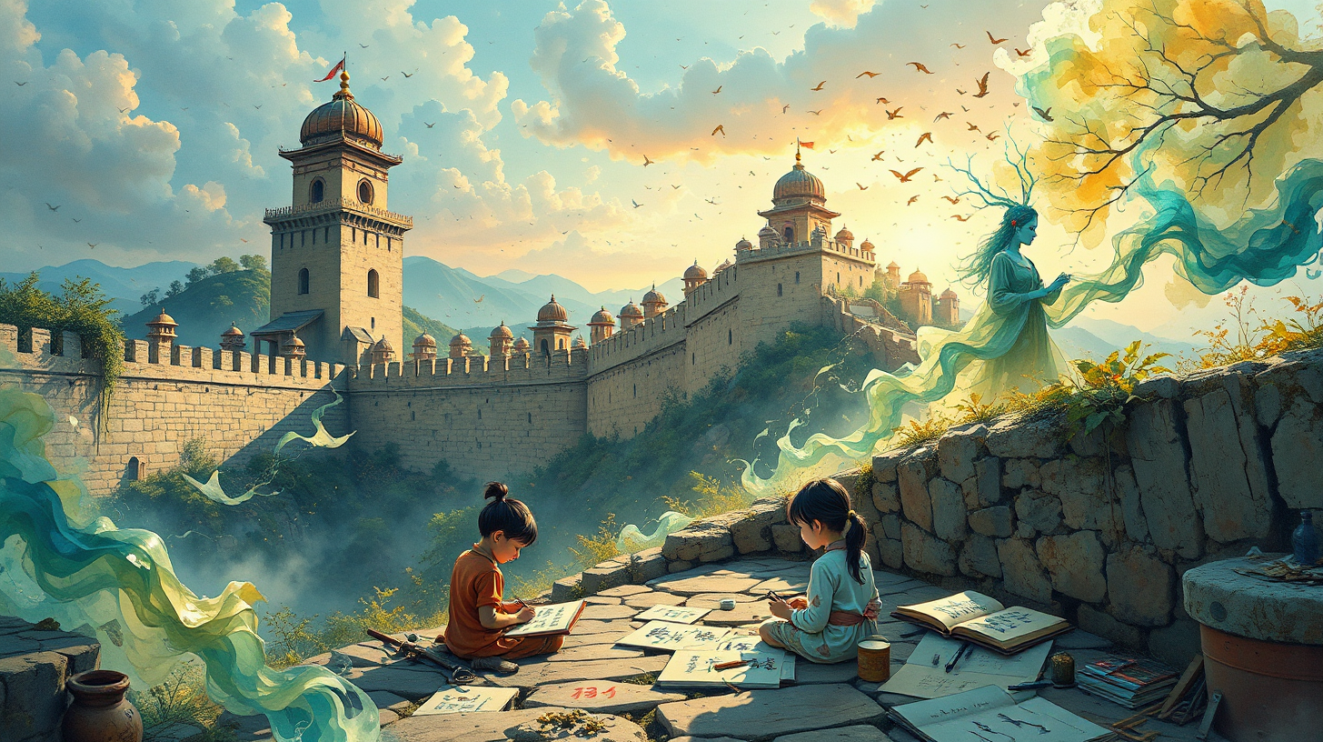 作图提示词:Within the confines of an ancient city wall, children playfully engage in calligraphy, while ethereal ink flows through the air, telling stories that bridge the past and future, illuminated by soft ambient lighting, showcasing a palette of vibrant colors and a dynamic perspective.