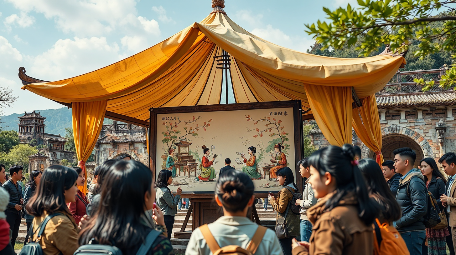 作图提示词:At the Yuming Tang ruins, a neural drawing robot creatively depicts traditional opera music beneath its canopied form. The interaction with curious passersby adds a lively atmosphere, captured in a close-up view that highlights the vivid colors and emotional expressions of the onlookers, showcasing a fusion of tradition and modern creativity.
