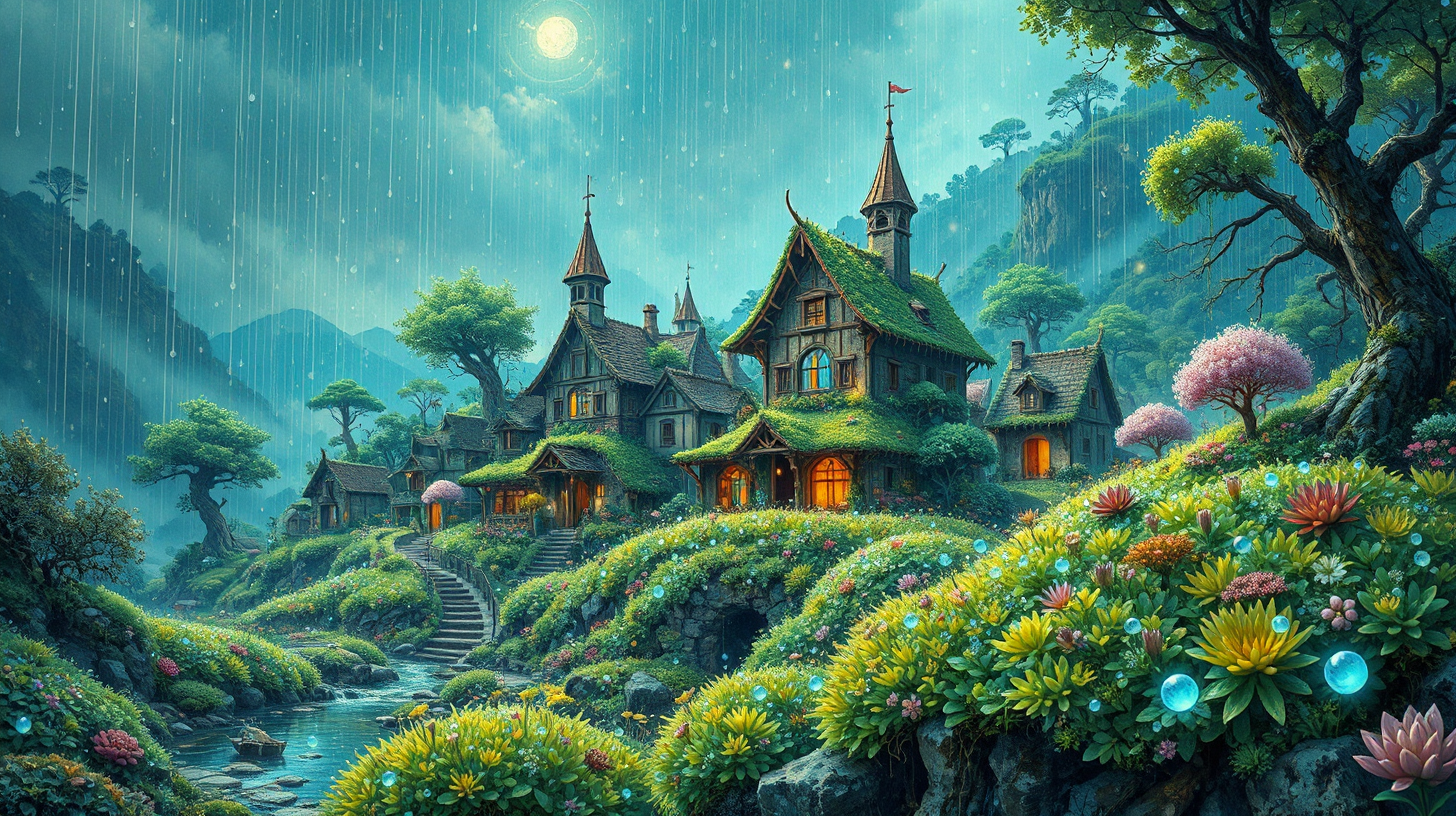 作图提示词:An enchanting ancient village adorned with bioluminescent quantum moss, where sparkling raindrops reflect life’s vitality. The scene portrays a mid-shot perspective that emphasizes the vibrant colors and textures of both the village and the microorganisms forming a natural barrier, celebrating the harmony of nature’s wisdom and beauty.