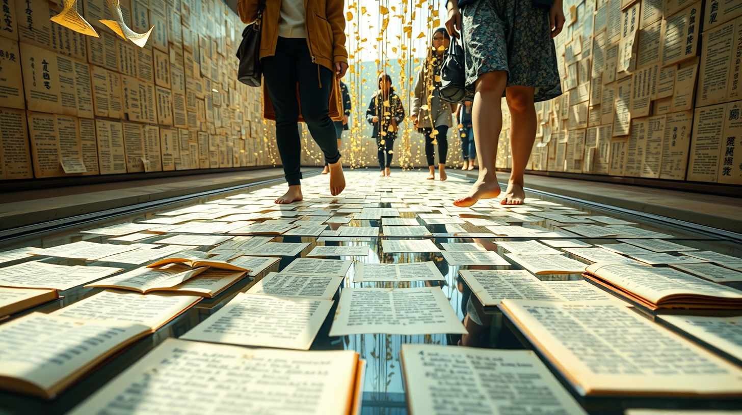 作图提示词:Inside the Tang Xianzu Memorial Hall, ancient texts cascade over a glass floor as students walk barefoot, symbolizing a connection to literature’s legacy. This scene is captured with a low-angle close-up, focusing on the intricate details of the texts and students’ feet, enhanced by soft lighting that evokes a sense of wonder and appreciation for literary heritage.