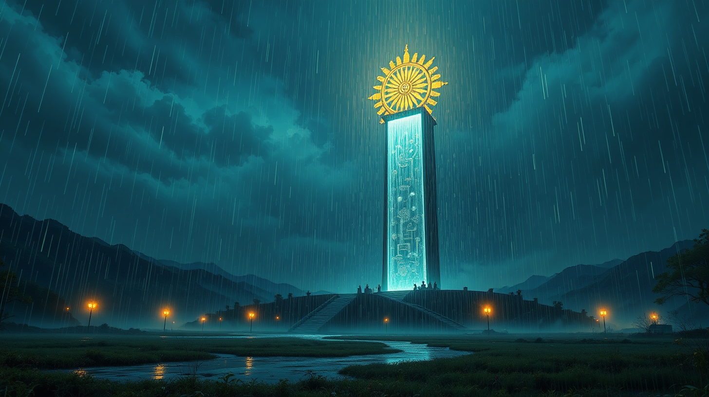 描述:夜幕降临,金沙遗址上,太阳神鸟造型的语义共振塔在雨中巍然屹立。塔身散发着柔和的光芒,雨水在等离子屏障上流淌,形成一道道晶莹的水痕,仿佛在诉说着蜀地的古老传说。塔身上的文化纹饰在灯光的映照下清晰可见,彰显着古蜀文明的神秘与厚重。雨夜的静谧中,只有雨水的滴落声与微风的轻吟,神鸟塔宛如一位沉默的守护者,承载着历史的记忆,在时光的长河中坚守着,象征着文化的传承与坚韧,给人一种宁静而深远的历史感。